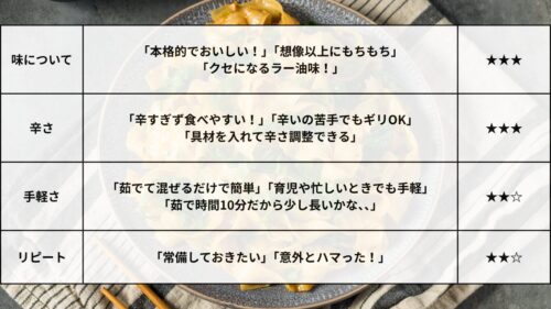 辛い物が苦手な僕の妻も、「辛いけどクセになる」と好印象でした。